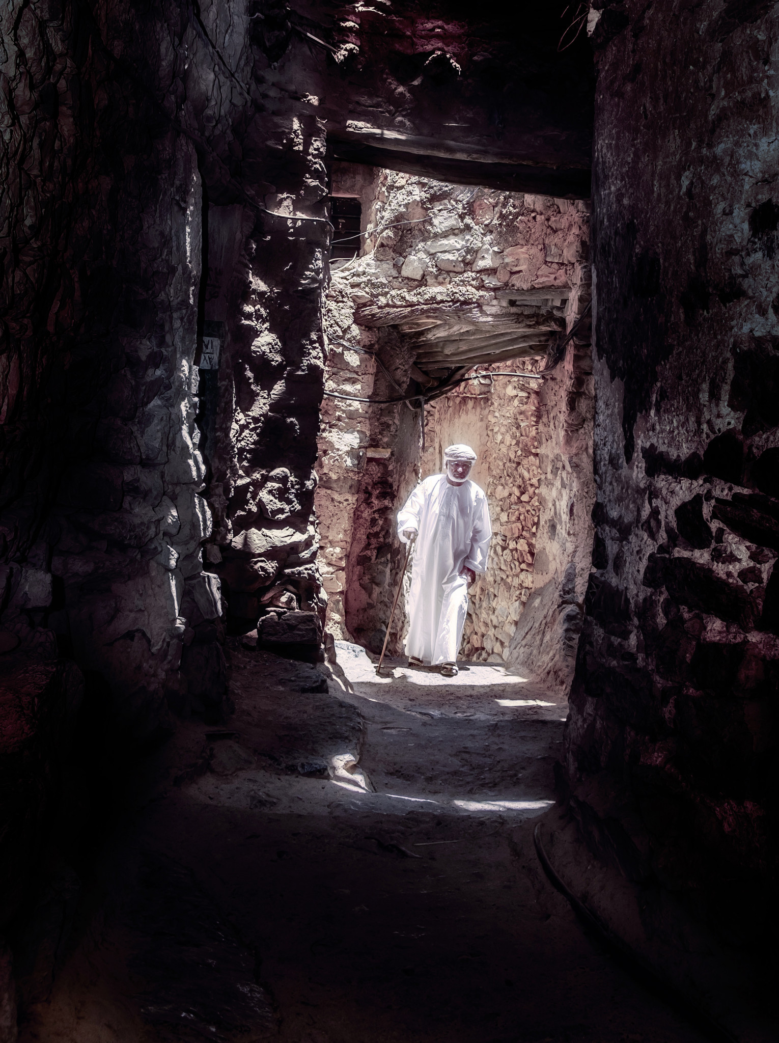 Вдруг в полуразрушенном дверном проеме, за которым зияет пустота, вырастает древний старик. Он одет в длинную серо-коричневую рубаху дишдашу и цветастую круглую шапочку кумму. Кажется, будто дед образовался прямо из камней и цветов.