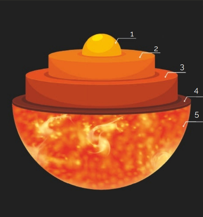 В центре Солнца находится ядро – самая горячая и плотная область. По разным оценкам, на ядро приходится от пятой до третьей части солнечного радиуса. Такой разброс цифр может показаться неприличным, но что же делать: никто еще не бывал внутри звезды. Впрочем, даже треть радиуса – это менее 4% объема Солнца и всего 10% его массы. Сердце светила невелико, но именно здесь происходят термоядерные реакции, делающие Солнце звездой.