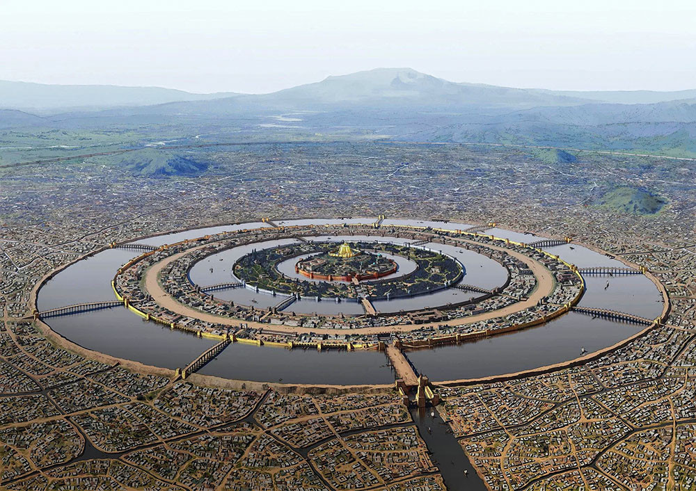 Платону, который архитектором не был и только теоретизировал о внешнем виде и устройстве идеального города, нравилась планировка в виде концентрических кругов, ведь круг – это совершенная геометрическая фигура, и сама вселенная сферична. Город правильной формы, построенный и поделенный с использованием сакральных чисел, соответствует законам мировой гармонии. В центре торговая площадь – агора, вокруг святилища, затем административные здания. Жилые дома расположены так, чтобы весь город представлял собой одну сплошную стену. «Приятно было бы видеть город, имеющий облик единого дома; к тому же, его, весь в целом, было бы чрезвычайно легко охранять и таким образом сберечь», – отмечал Платон в диалоге «Законы». Горожане, скромные и честные труженики, владеют в нем равными участками земли. В другом произведении философ рассказывал о столице мифической Атлантиды, городе, который бог Посейдон построил с такой же концентрической планировкой. Остров, где жила его возлюбленная, бог окружил двумя земляными и тремя водяными кольцами, которые их потомки застроили дворцами, мостами и святилищами.