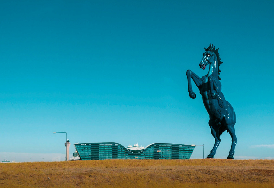 Скульптура мустанга из стекловолокна высотой 9,8 метра и весом 4,1 тонны со светящимися в темноте красными глазами может напугать тех, кто прилетает ночью в аэропорт Денвера. Ее официальное название «Синий мустанг», но местные жители называют коня «Блюцифер».