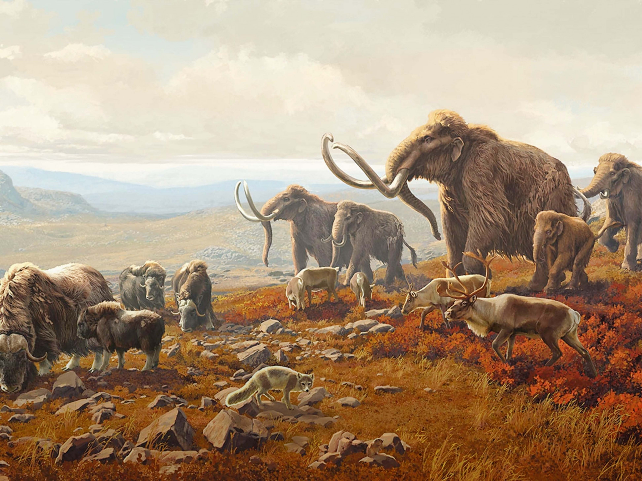 «Ледниковый период» по-научному называется плейстоценовой эпохой (или плейстоценом). Он начался 2,6 млн лет назад и закончился 12 тысяч лет назад. За это время случилось несколько ледниковых и межледниковых эпох. Последнее оледенение началось 120 тысяч лет назад и закончилось вместе с плейстоценом. В последнюю ледниковую эпоху появилась совершенно особая природная зона. По-русски она обычно именуется тундростепью, а по-английски – «мамонтовой степью». Сегодня найти такой ландшафт практически невозможно. Лишь кое-где уцелели крошечные участки реликтовой тундростепи, например, на алтайском плато Укок и на южных склонах гор Северо-Восточной Сибири и Аляски.