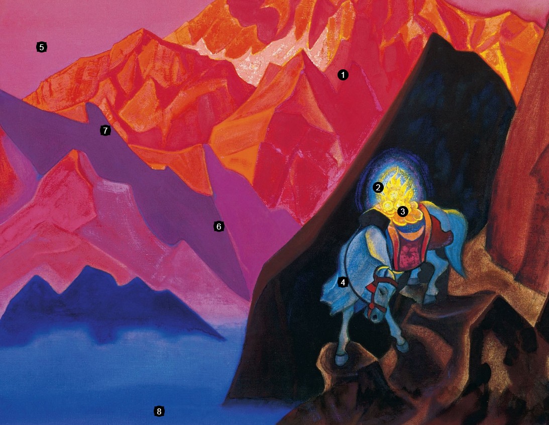 1. ГОРЫ. Многочисленные изображения Гималаев и Тибета стали визитной карточкой художника. Как пишет историк Всеволод Володарский, исследователь его творчества, за Рерихом прочно закрепилось определение «мастер гор». Для художника Гималаи стали символом духовного восхождения человека. При этом Рериху было важно писать пейзажи с натуры: «Убедительность — это магическое качество творчества, не объяснимое словами, — создается лишь наслоением истинных впечатлений действительности. Горы — везде горы, вода — всюду вода, небо — везде небо, люди — везде люди. Но тем не менее, если вы будете, сидя в Альпах, изображать Гималаи, что-то несказуемое, убеждающее будет отсутствовать».
