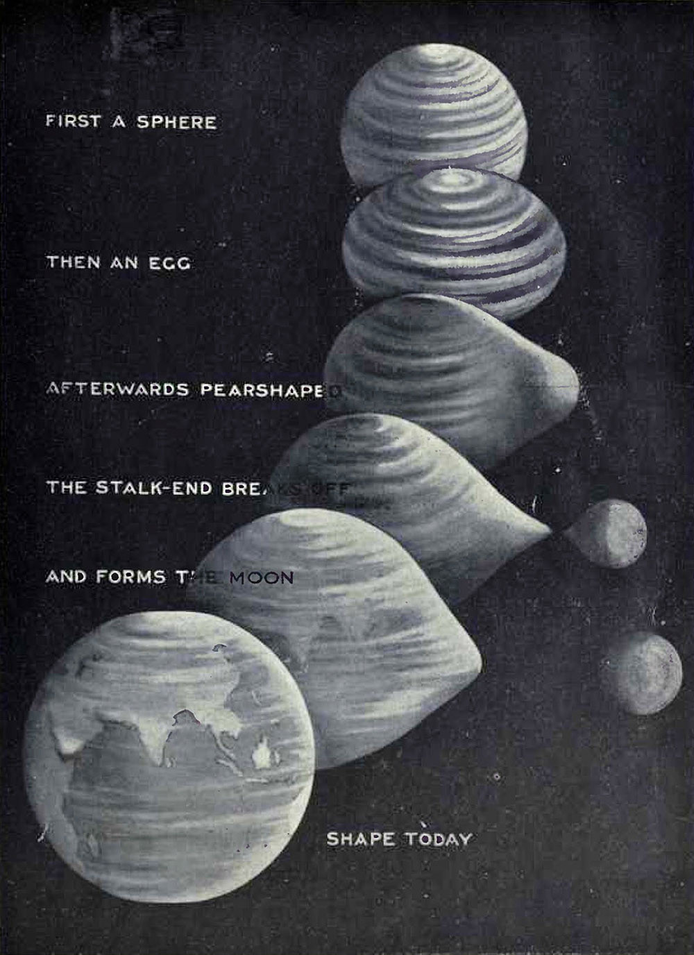 В 1878 г. астроном и математик Джордж Дарвин, сын знаменитого биолога, предложил свою теорию образования Луны. По его мнению, некогда Земля вращалась вокруг своей оси так быстро, что от нее отрывались куски. Из этого потерянного вещества и сформировалась Луна. Дарвин, как и многие в его время, считал новорожденную Землю расплавленной. Это добавляло веса его теории: жидкие тела не слишком прочны.