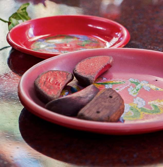 Вход через Дракона, выход через Тигра. В небе за воротами Дракона плавает дым курильниц, а на фоне льющейся откуда-то музыки и мерного звона колокольчика то и дело рассыпается стук. Это падают на каменные плиты двора тайбэйского храма Луншань красные «печеньки». Когда я впервые увидела полную чашу деревянных полумесяцев, покрытых красной краской, они напомнили мне формой печенье шакер-пури из советского детства. Одна сторона плоская, другая выпуклая.