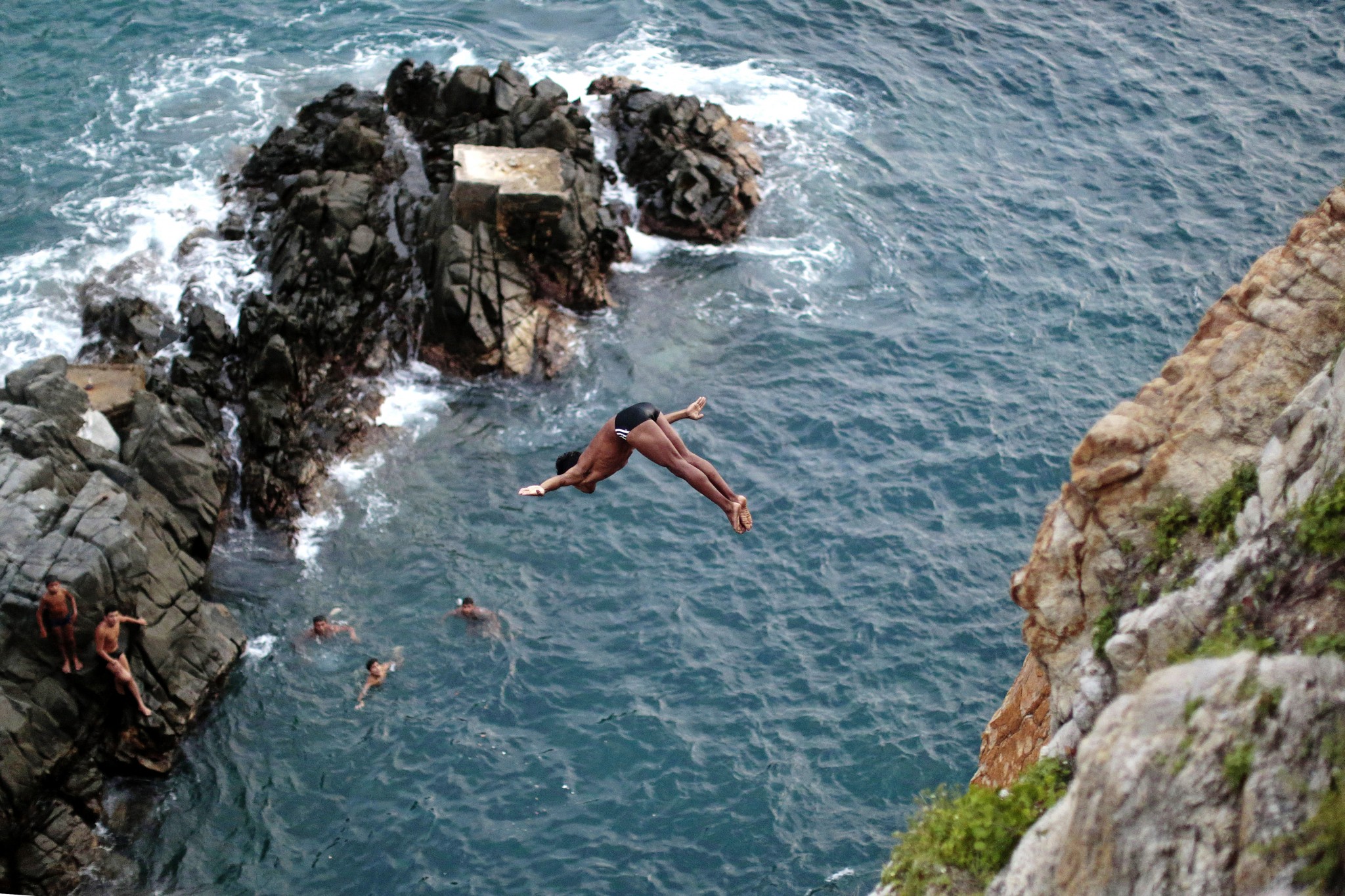 Океан, похоже, чем-то рассержен: волны цвета индиго разбиваются о подножие скал с каким-то особым неистовством. Скала Ла-Кебрада, всемирно известная достопримечательность Акапулько, в лучах послеполуденного солнца играет острыми рельефами и складками. На самом верху — человек, который кажется размером с игрушечного пупса. Площадка для зрителей расположена на скале поменьше, которую от Ла-Кебрады отделяет узкая, всего семь метров в ширину, заводь — в нее-то и ныряют клавадисты. Народу на площадке много: высокий сезон. Я приехала за 20 минут до начала представления, чтобы занять место получше, а те, кто пришли за несколько минут, предпочли подождать следующего шоу.