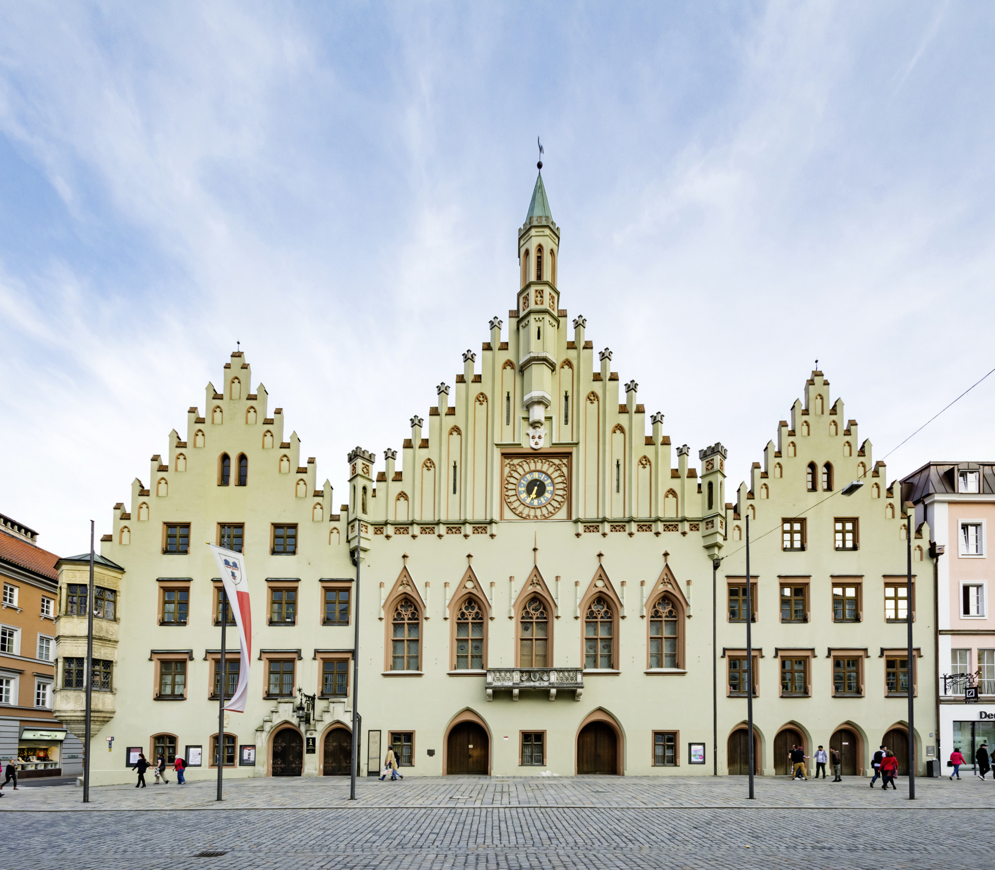 Здание ратуши баварского городка было создано в 1860–1861 годах путем объединения трех изначально отдельных готических домов, приобретенных властями в XIV–XVI веках. Автор проекта архитектор Леонард Шмидтнер вдохновился аналогичной перестройкой ратуши во Франкфурте-на-Майне. В конце XIX века фасад здания был реконструирован и обрел единый неоготический вид. Сегодня в ратуше по-прежнему находится городская мэрия.