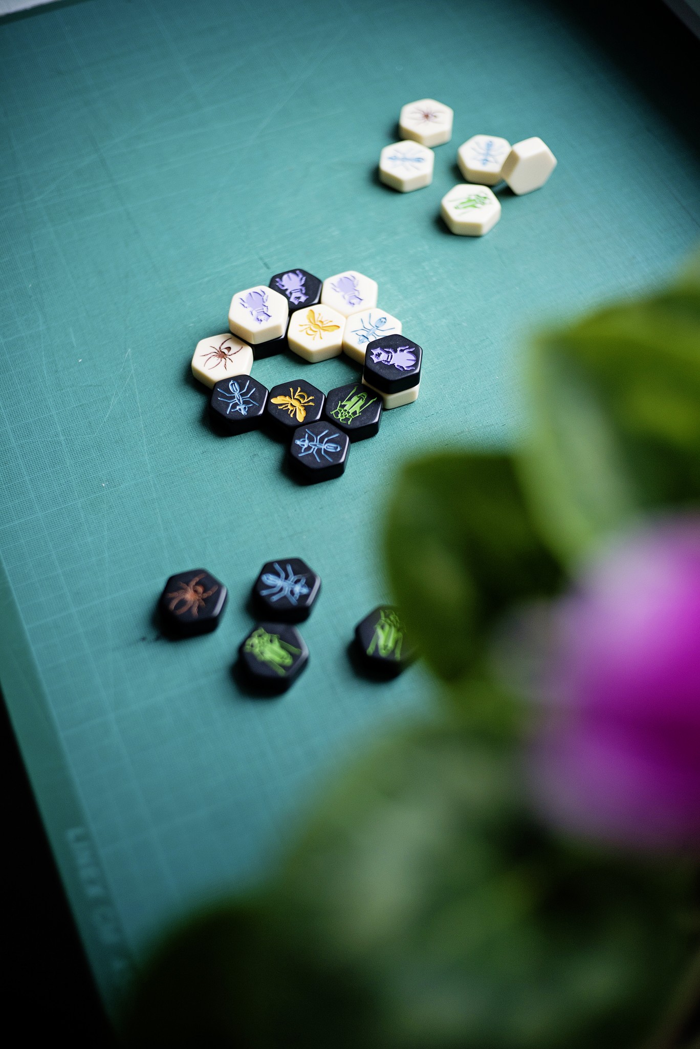 Первую тысячу комплектов изобретатель сделал своими руками. Знакомый краснодеревщик вытачивал на станке фанерные шестиугольники и отдавал их Янни даже не отшкуренными. Джон, его жена и друзья днями и ночами шкурили деревяшки и наклеивали на них распечатанные изображения насекомых. Комплекты распродавались быстрее, чем появлялись на свет, и настал черед промышленного производства. Начиная с третьего тиража фигуры стали отливать из тяжелого, приятного на ощупь бакелита, из которого делают костяшки для домино и маджонга. В таком виде игра выпускается до сих пор, в том числе в стильном черно-белом варианте Carbon.