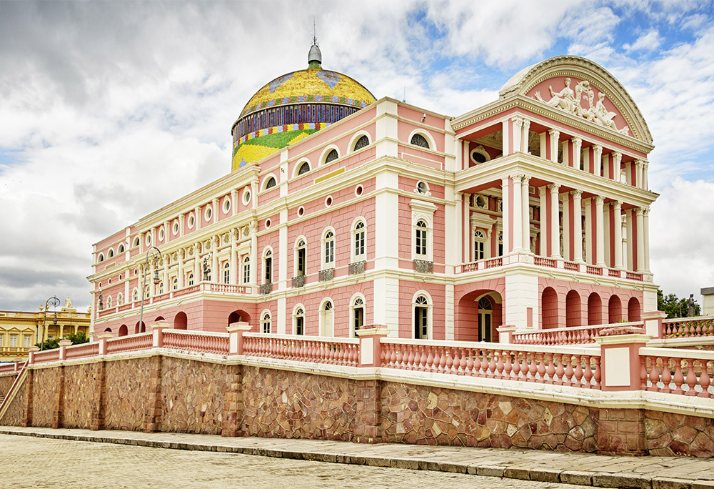 Мы стоим на мостовой у Амазонского театра – пожалуй, самого эклектичного театра в мире. Розовый фасад в неоклассическом стиле увенчан куполом, покрытым яркой мозаикой. Купол похож на те, что можно увидеть на средневековых мечетях. Кажется, что его приделали к зданию случайно: уж слишком он «выпадает» из архитектурной концепции. С другой стороны, эта особенность делает Театро Амазонас узнаваемым. Будь он просто красивым зданием, без изюминки, – его было бы труднее запомнить.