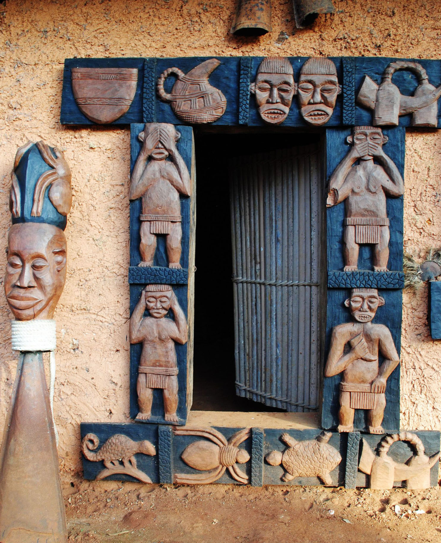 Вечером нас ждал прием у короля, на частной половине дворца. Его величество Наянг Тукам принимал нас по-домашнему, в гостиной, где традиционные предметы дворцового декора соседствуют с огромным телевизором и многочисленными фотографиями. Разговор быстро перешел к проблеме сохранения традиции – вопрос особенно актуальный, поскольку тяжелое колониальное прошлое страны существенно отразилось на художественном мире западных королевств. Даже в тронных залах и святилищах предков практически не осталось скульптур и архитектурного декора, созданных до 1950-х годов: огромная часть наследия была вывезена в европейские страны. Только в музеях Германии хранится более 40 000 предметов искусства Камеруна, и огромная их часть – именно из региона Грассфилдс. В период германской колонизации европейцы сознательно разрушали политическое и культурное единство традиционных общин, лишая их значимых культовых предметов: вывозили или уничтожали маски, скульптуры, барабаны. Господство колонизаторов стало для населения этой страны травмирующим событием; это ясно видно и в устном историческом предании, и в книгах камерунских авторов. Королевства на западе Камеруна пытаются восстановить утраченную традицию и заказывают резчикам новые предметы власти и статуса. Создавая троны, церемониальные табуреты, фигуры предков и обрамления порталов, мастера ориентируются на немногие сохранившиеся старые образцы и активно используют мотивы и скульптурные стили соседних этносов. Правда, многие ныне недоступные материалы приходится заменять более простыми: слоновьи бивни – деревом, коралловые бусины и богатый стеклярусный декор второй половины XIX века – непритязательным китайским бисером, а шкуры леопардов – фабричными тканями.
