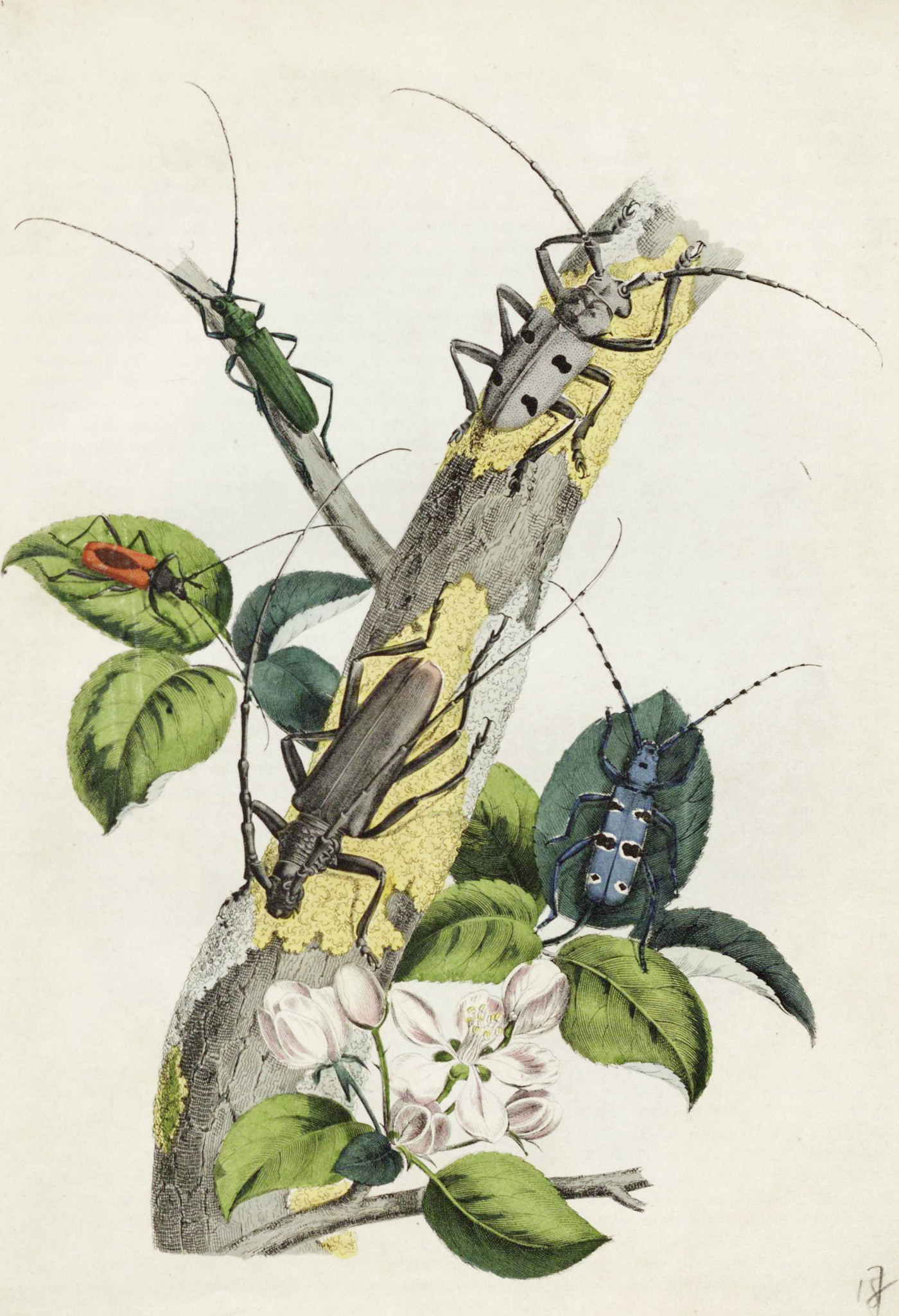 На прилагаемом рисунке изображено пять жуков-дровосеков, называемых также усачами и скрыпунами. Название усачей станет понятно всякому, кто посмотрит на рисунок; скрыпунами зовут их потому, что они издают странный, скрыпучий звук, когда возьмешь их в руки; наконец, дровосеками они называются потому, что истребляют большое количество лесу, не хуже какого-нибудь дровосека на двух ногах. <…>