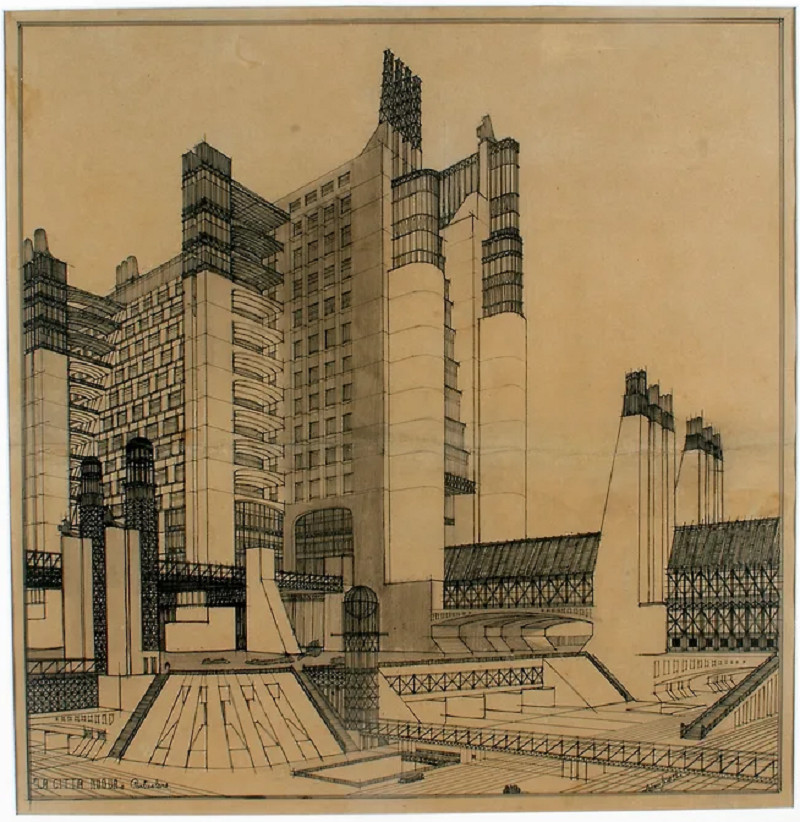 Никакой предыстории у проекта нет. Антонио Сант-Элиа до 1909 года был молодым инженером-строителем без выраженных художественных интересов, далее поступил в академию, получил диплом архитектора в Болонье в 1913-м. Более или менее ничего из его работ до 1914 года, в том числе и диплом, не предвещает Citta Nuova. В 1914 году он создает этот проект, показывает его на выставке «Новые тенденции» в Милане, знакомится с лидером итальянского футуризма Филиппо Маринетти, публикует в соавторстве с ним «Манифест футуристической архитектуры». В 1915-м уходит добровольцем на фронт и в 1916-м погибает 28 лет от роду, не успев ничего объяснить.