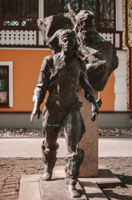 Это город, выстроенный на оси Октябрьского проспекта, идущего от вокзала до кремля. Это очень хороший проспект, в основном сталинский, но с небольшими вкраплениями дореволюционных домов, выстроенный более или менее как бульвар (хотя ряд деревьев периодически разрывается домами, выдвинувшимися поближе к проезжей части),— как бы улица Горького. Он проламывается через стену Окольного города (ныне улица Свердлова), которая в месте пересечения выглядит разрушенной, как после танкового штурма, стрелой летит к кремлю, но вдруг попадает в какую-то малозастроенную местность Анастасиевского сквера со скульптурой «Два капитана» (1995, М. Белов и А. Ананьев). Хотя постановка этого памятника определяется тем, что город Энск, откуда родом главный герой замечательного романа Вениамина Каверина Саня Григорьев,— это Псков, но сам памятник изображает героя бредущим по Арктике в поисках места гибели экспедиции капитана Татаринова, а Татаринов витает над ним в виде разрываемого ветром чугунного облака. Это довольно выразительно, но создает впечатление, что Октябрьский проспект привел тебя в снежную пустыню. После этого проспект начинает как-то склоняться к северу, чтобы в итоге через сквер Влюбленных слиться с улицей Ленина. Путь здесь начинает ветвиться извивами Советской улицы, но общее направление все же ведет к кремлю, в который ведет узкий проход через боковую Рыбницкую башню Довмонтова города.
