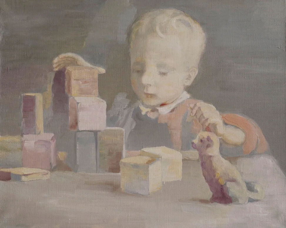 Изысканность жемчужно-облачных колоритов не должна обманывать: она не столько от визуальной онтологии детского портрета, не от рубенсовских светлых кудряшек, удивленных глаз и серебристого атласа, не от пухлых путти елизаветинского барокко и не от трепетных гармоний Валентина Серова, сколько от завороженности работой времени, стирающего фреску и высветляющего фотографию, и от желания предвосхитить эту работу, заранее придать живописи облик руины. Здесь вовсе не праздничная, а погребальная, потусторонняя, метафизическая белизна — снимки детей времен войны, волнующие художницу более всего, как правило, темные и мрачные, при транспонировании в живопись обретают меланхолическую предсмертную бледность. На фотографиях дети смотрели в объектив — теперь они глядят на зрителя в упор, очами без зрачков, глаза в глаза, глаза в душу, словно бы хотят пробиться взглядом сквозь толщу времени и требуют ответа. Это строгий взгляд ангела. Это трагический взгляд человека — обреченного на изгнание из рая детства, перед лицом катастрофы, перед лицом взросления и всего, что за этим следует. И напряжение взгляда превозмогает земное и смертное.