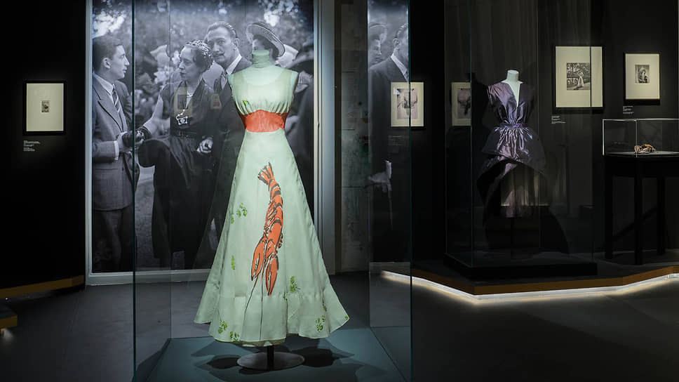 Но помимо рисунков есть, например, объект Дали «Veston aphrodisiaque» — пиджак, увешанный стаканами. Его соседство с платьями Скьяпарелли хорошо показывает разницу между сюрреалистским арт-объектом и сюрреалистской одеждой и то, что сама Скьяпарелли эту разницу прекрасно понимала. Она думала о платьях прежде всего как о том, что носят женщины. Ее метод ясно демонстрирует знаменитое «платье с омаром».