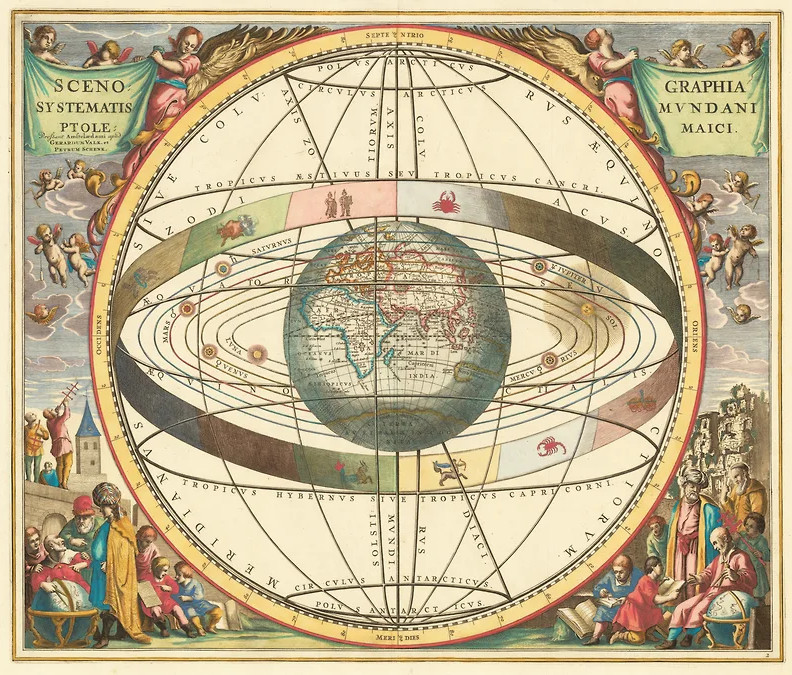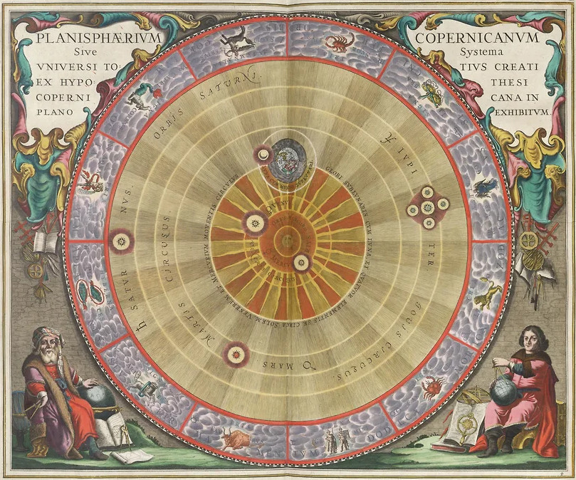 Огромному количеству вполне образованных людей в этот момент кажется, что научный консенсус на стороне другой теории, привычного всем геоцентризма: в центре Вселенной — неподвижная Земля. Консенсус этот, правда, древний, еще языческий, потому что восходит эта схема устройства мира к Аристотелю. Землю окружают семь концентрических сфер, по которым перемещаются планеты, а дальше сфера неподвижных звезд — и, собственно, все, предел тварного мира. Это картина абсолютного совершенства: сфера — самое совершенное из тел, семь — священное число, и устройство планетных небес, неподвластных земной скверне и изменчивости, исполнено высшей стройности, соразмерности и гармоничности. Так выглядит Вселенная, например, в «Божественной комедии» Данте.
