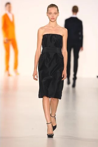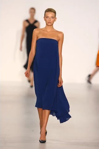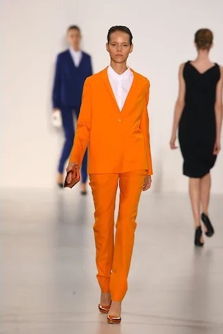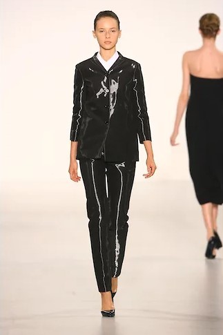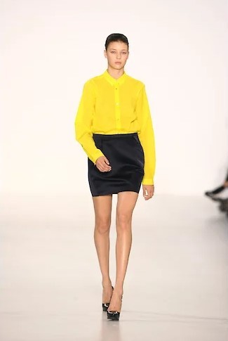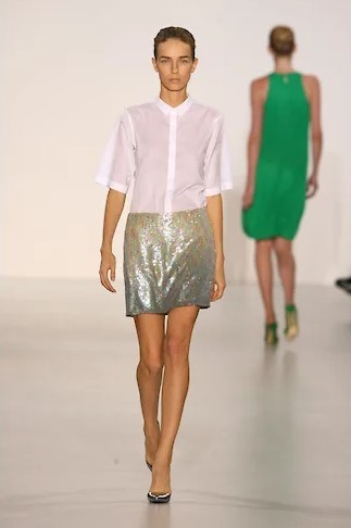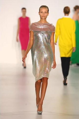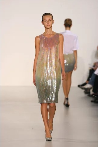 Прежде всего Симонс добавил цвет — к традиционному сандеровскому черному, белому и синему — ярких маркерных оттенков желтый, зеленый и фуксию, электрик синий. Рубашки этих цветов, надетые с простыми прямыми мини-юбками из плотного темно-синего шелка-дюшес или с темными же костюмами классического силуэта Сандер — узкие прямые брюки и простой прямой пиджак на одну пуговицу, платья этих цветов — до колена и длинные, простого прямого кроя — станут основой коллекции. К ним Симонс добавит серебристую кожу и перламутровые переливы пайеток — они станут его постоянными элементами, перламутровые переливы мы потом увидим на диоровских кринолинах, а серебристую кожу, например, на перчатках пожарного и капоре-шлеме из коллекции CALVIN KLEIN FW 18, описанной в нашем