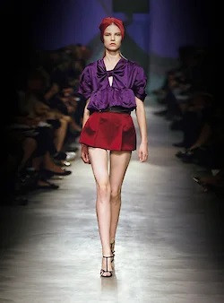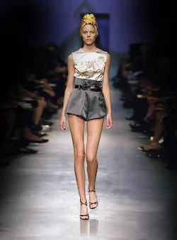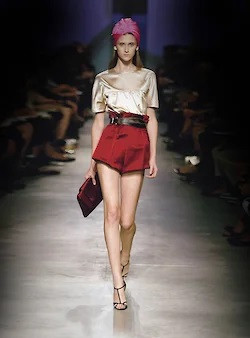 Прада в том же самом сезоне, весна-лето 2007, покажет чалмы, сделав их тем самым ударным аксессуаром, который станет бестселлером. В чалмах Prada SS 07 появятся все, вся светская хроника будет в этих самых чалмах, их будут носить без разбора и юные барышни и солидные дамы — в общем, возникнет тот самый эффект хита, который Миучча Прада так отлично умела организовать в 2000-е. Но на подиуме они произведут впечатление не в последнюю очередь благодаря тому, что будут соединены с трусами — атласными, с максимально высокой талией, стилизованными под 30-е годы. В коллекции были и чалмы с юбками, и чалмы с платьями, и чалмы с суперкороткими кофтами, едва прикрывающими уже обычные трусы, но именно чалмы с высокими атласными трусами, которых было буквально пять выходов на все дефиле, стали самыми цитируемыми и узнаваемыми луками из той коллекции. Трусы сами по себе — вообще белье, будуар,— не были какой-то новостью, а даже были вполне исторической частью моды, как и сама по себе чалма, тоже не впервые тогда выведенная на подиум, но вместе они были настолько из разных опер и настолько не стыковались с тем, как можно одеться, что это вызвало особое оживление. И Прада на бэкстейдже после показа успокаивала журналистов в том смысле, что не волнуйтесь, никто не заставляет ходить в трусах и чалме, есть же и разные юбки и платья. Пропорции опять же были максимально смещены в сторону ног и их длины, и вообще эти плотные атласные трусы смотрелись восхитительно.