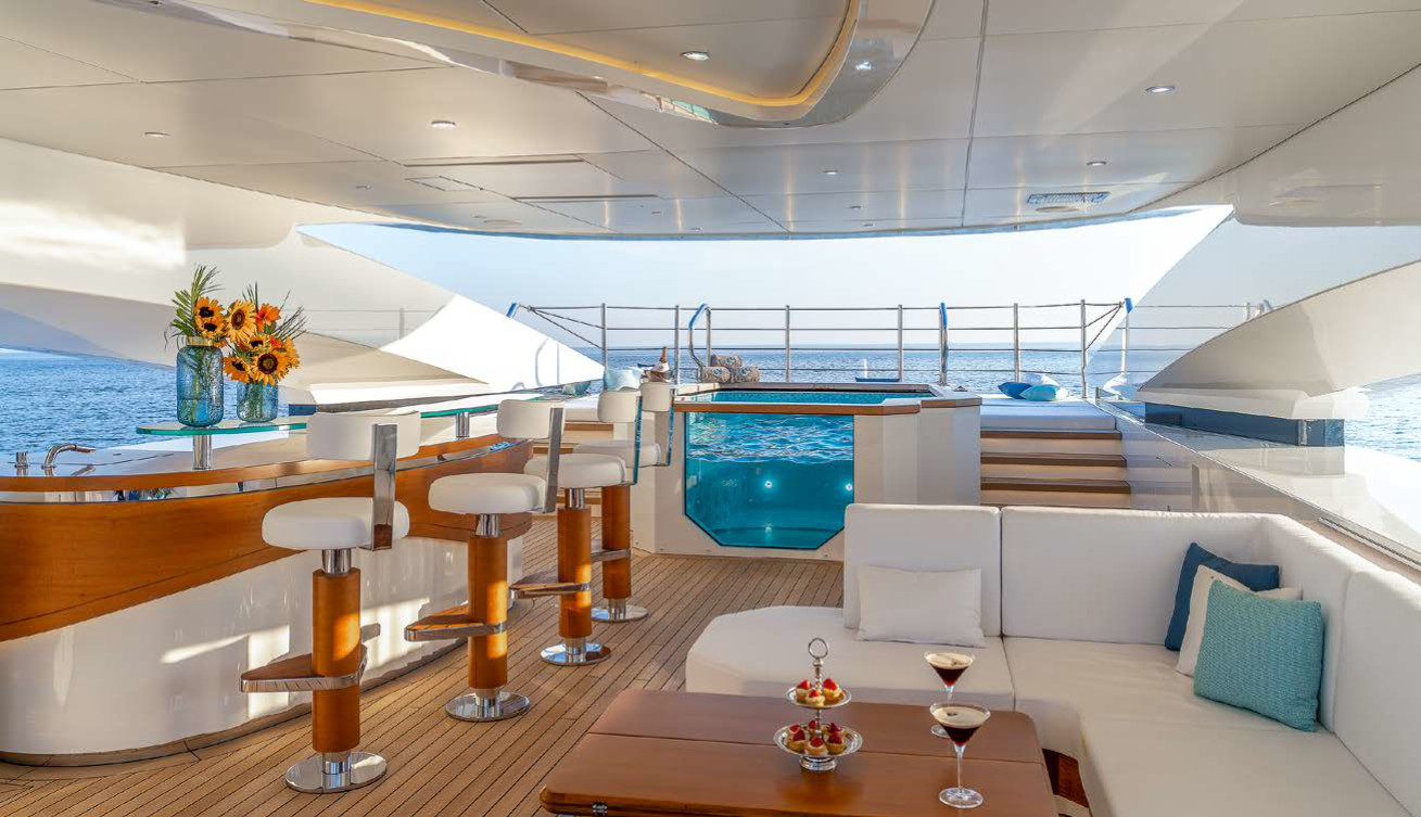 Дизайнеры сформировали сандек, где, помимо диванов и двух «соляриев», есть бассейн-джакузи объемом 5000 л с прозрачным дном и бортом. Спланировали кормовую часть палубы мостика (она же — верхняя палуба) с диваном и обеденным столом. Были скомпонованы фордек с диванами визави, кокпит на главной палубе, тоже с большой диванной группой, и, конечно, «пляжный клуб». Он включает в себя удобную купальную платформу-трансформер у самой воды и зону отдыха внутри, в которой за стеклянной переборкой обустроена сауна. Чтобы гости на этой части палубы чувствовали себя максимально комфортно, дизайнеры перенесли «базу» морских «игрушек», в частности аквабайки, на носовую палубу. Там предусмотрен кран, и, кстати, такое решение обеспечило более свободную работу экипажа.