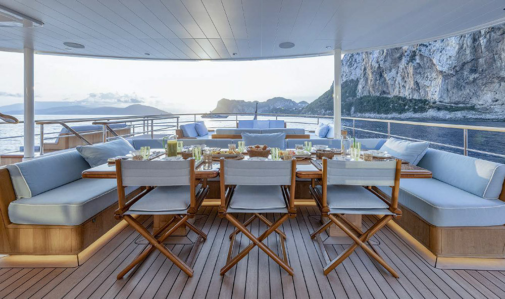 Помимо надстройки, где характерная и строгая яхтенная архитектура прошлых лет выражена в форме окон на трех ярусах, в плоской крыше ходовой рубки на палубе мостика и деревянных конструкциях, морские традиции прослеживаются в тотальном доминировании тика на палубах и даже в отдельных деталях. Я имею в виду световые люки на фордеке — не современные скайлайты заподлицо с палубой, но объемные конструкции из дерева и стекла, а также хромированные вентиляционные трубы с приемным дефлектором (давно таких не видел). Но давайте прогуляемся по всем палубам.
