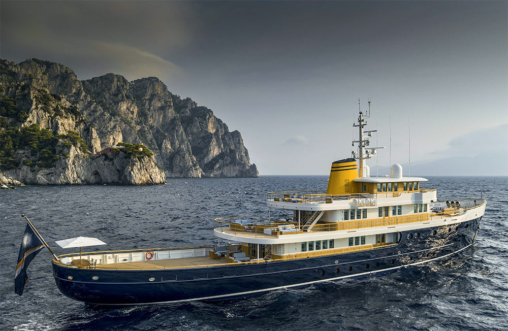 Разглядывая Blue II, с нее не соскользнешь взглядом: она магнетически притягивает. Дизайнеры спроектировали экспедиционную суперяхту, напоминающую океанский буксир-спасатель второй половины XX века, с нетипичной для моторных яхт вельботной кормой, классической надстройкой и даже фальш-трубой, более уместной на судне с паровыми машинами. У яхты умеренный наклон форштевня, высокий борт в носовой части и низкий в кормовой, там, где открытая палуба большой площади с погибью… При всем этом профиль судна вполне сбалансированный, и уникальная эстетика корабля-трудяги уживается в нем с «душой» классической моторной яхты.
