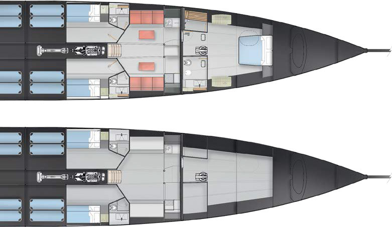Другой важный аспект проекта — вторая ипостась ClubSwan 80 как быстроходного круизера. Несмотря на очевидную противоречивость требований к конструкции гоночной лодки по отношению к круизной, дизайнерам и конструкторам удалось решить эту задачу, создав гоночно-круизную яхту без ущерба одному или другому варианту (модификации).