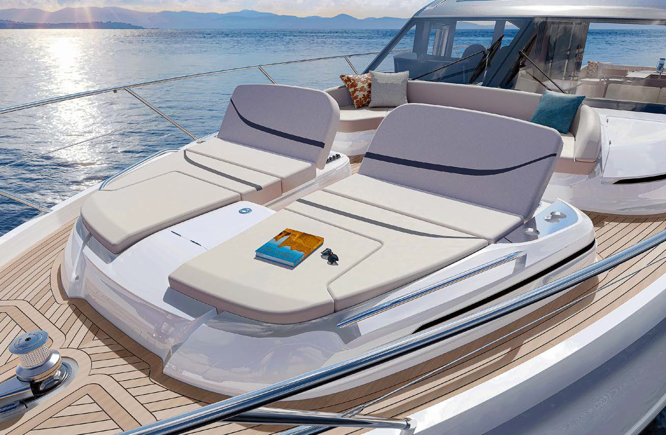 В просторном самоосушаемом кокпите сохранился U-образный диван со складным тиковым столом и ветбар на левом борту, являющийся логичным продолжением камбуза. В кокпите предусмотрены варианты: по правому борту можно поместить сервировочный блок с выдвижным холодильником на 100 л или обращенный в корму L-образный диванчик. Под большим «солярием» в самой корме будет гараж для тендера с электрической лебедкой для его спуска/ подъема. Гараж, похоже, слегка увеличили, и там поместится Williams Sportjet 345 или другой аппарат для развлечений на воде. И, конечно, никуда не делась платформа с приводом (электрогидравлика) грузоподъемностью 500 кг.