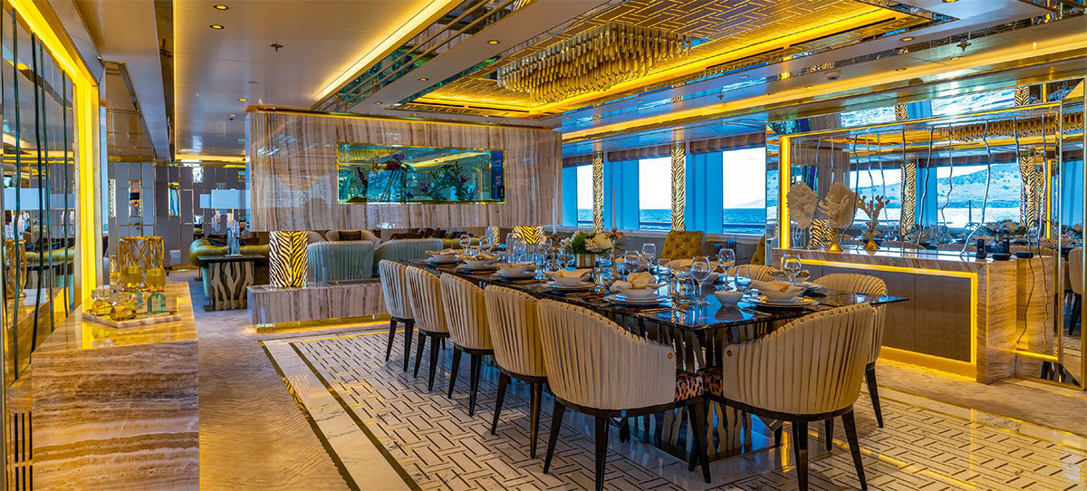 Помимо салона, на главной палубе находятся облицованный «латами» из нержавейки камбуз, примыкающий к нему сервировочный буфет, центральное лобби и две одинаковые по площади, но не зеркальные VIP-каюты. У гостей есть выбор: перемещаться между «этажами» на лифте или по центральной лестнице. Перед нами тот случай, когда второй вариант гораздо интереснее. Почему? Потому что мраморную лестницу с дизайном от Lithos окружает необычный «колодец» — стена с пузырьками, которую придумала флоридская компания Blueworld. В закрытом контуре стеновых панелей находится дистиллированная вода, и, поскольку туда не попадает солнечный свет, она не цветет. На лифте, впрочем, тоже стоит прокатиться, так как здесь это не скучная прозрачная капсула, но своеобразный «золотой саркофаг».