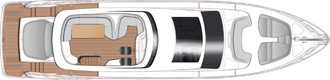 Стала иной компоновка верхней палубы спортбридж, давшей название всей линейке Sportbridge. По сути, это модификация флайбриджа, его уменьшенный по длине за счет носовой части вариант, отчего такая открытая палуба зрительно выглядит смещенной в корму. Если прежде пост управления был на левом борту, один диван располагался рядом, а другой — в кормовой части, теперь рулевая консоль «переехала» на правый борт, а на левом установили два несимметричных дивана (кормовой со складным тиковым столом). Есть и ветбар с барбекю.