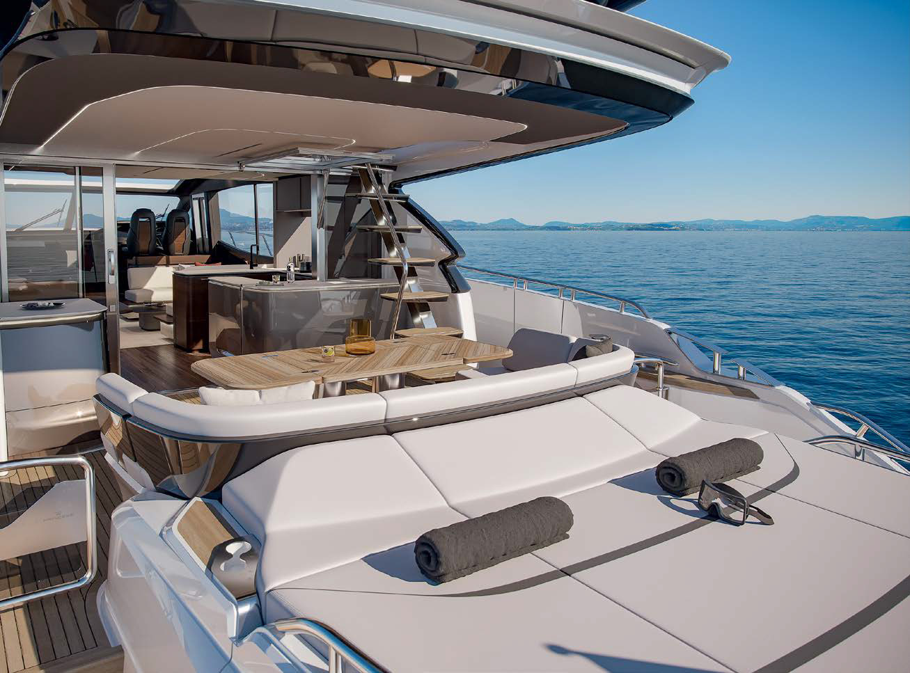 Пройдемся по открытым участкам главной палубы. На фордеке теперь стоят два шезлонга новой конструкции с регулируемыми подголовниками, из которых при желании образуется диван, обращенный в корму, визави по отношению к дивану перед надстройкой. Рундук между шезлонгами легко вместит холодильник для напитков. А в самоосушаемом, покрытом тиком кокпите организована обеденная зона с U-образным диваном (за ним видим просторный лежак-«солярий») и складным тиковым столом. Отсюда по трапу можно попасть на верхнюю палубу или пройти по ступеням с обоих бортов вниз, на опускаемую тиковую купальную платформу. Под лежаком находится гараж для тендера (3,9 м) с интегрированной системой его спуска на воду; отдельная дверь ведет в каюту экипажа; предусмотрен и отсек для хранения подводных буксировщиков Seabob.