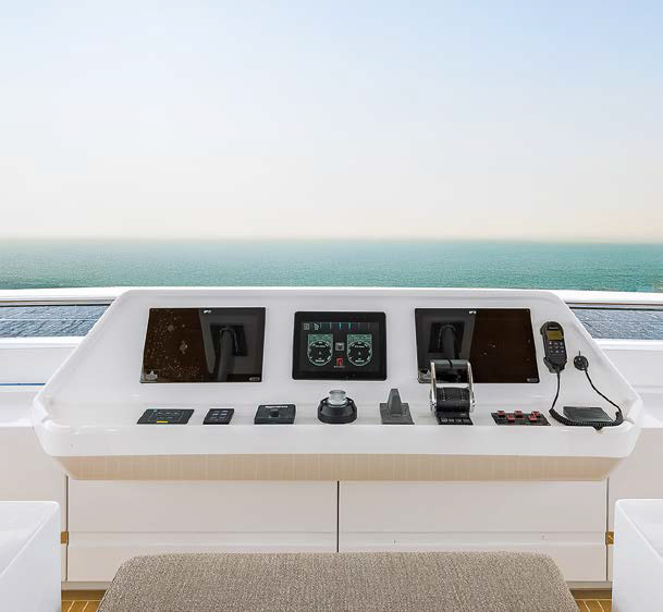 У Казали получилась хорошо сбалансированная в отношении пропорций яхта с четким абрисом. Ее протяженный флайбридж (до 90 кв. м), практически весь накрытый хардтопом, условно поделен на зоны. Там разместились пост управления, мягкие диваны, обеденный стол, бар с грилем, большие лежаки, джакузи. Эту палубу можно использовать как кинотеатр под открытым небом или заказать закрытой (полностью/частично).