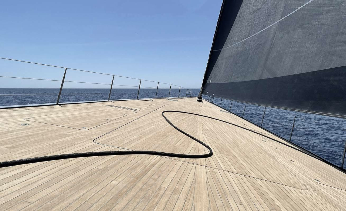 Открытая планировка кокпита выполнена практически в одной плоскости, как у моторных яхт. В кокпите, который может накрываться большим тентом, владельцу и гостям комфортно отдыхать и обедать. Транец откидывается, образуя большой (20 кв. м) «пляжный клуб» с баром и сауной. Откидные платформы по бортам обеспечивают безопасный доступ на борт, к воде или тендерам. Зона фордека может похвастаться такими элементами, как джакузи и… стенка-скалодром на внутренней стороне двери гаража для тендера.