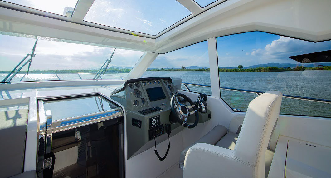 Это лодка hard top (без дверей из кокпита в салон) «типового» европейского формата, вполне спортивная и стильная за счет стройного корпуса, форм надстройки и бортового остекления с жестким контуром.