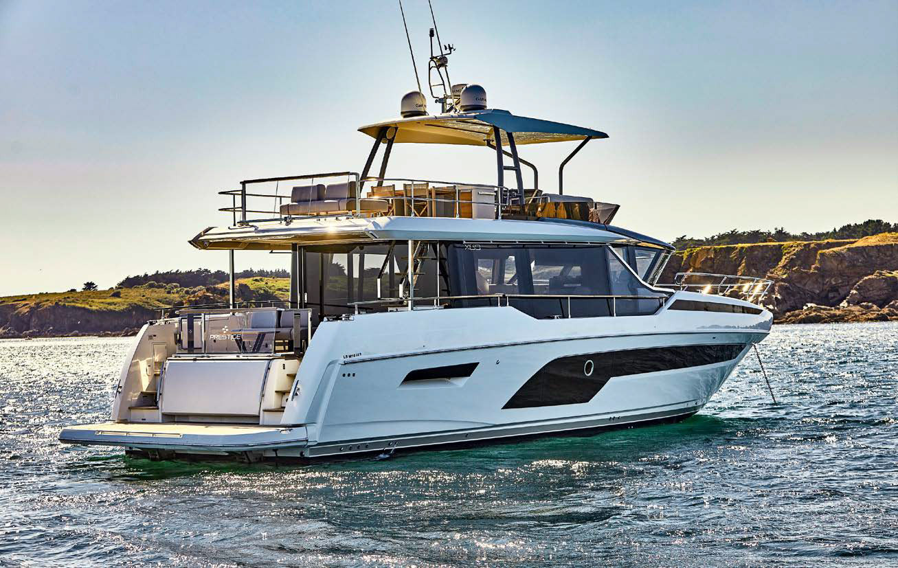 Вторая яхта в линейке Prestige X–Line, проект которой разработали дизайнеры Garroni Design, интерьерный дизайнер Валентина Милитерно ди Ромедис, а также инженеры Prestige Engineering. Эта яхта из стеклопластикового композита, присоединившаяся к Prestige X70, получила от нее ряд особенных черт в экстерьере. В их числе характерные линии надстройки с обратным наклоном лобового стекла, линия фальшборта и форма остекления в корпусе. Кокпит infinity (прозрачное ограждение в сторону транца) открывает вид на море и соединяется с салоном через большую кормовую дверь с электроприводом и сдвижную на левом борту. В корме открытый «пляжный клуб» образует диван, сиденье которого спрятано в откидном транце, и мощная гидравлическая платформа. На верхней палубе находится открытый пост управления, за ним мини-камбуз, большой обеденный стол и зона отдыха.