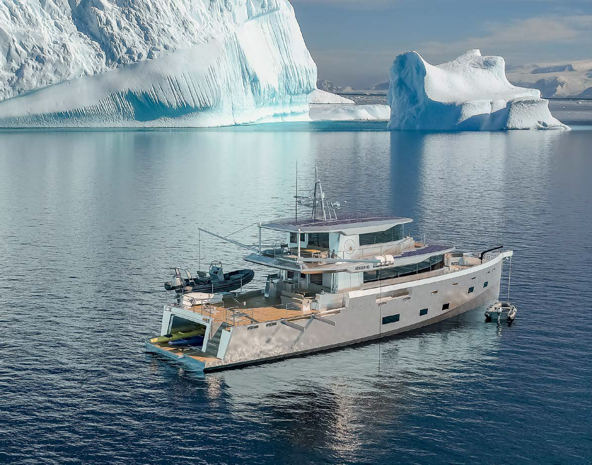 В основу проекта яхты-эксплорера британского бренда Arksen положена функциональность, а дизайн является ее «производной», хотя внешне лодка выглядит весьма незаурядной. У трехпалубной яхты с корпусом из легкого сплава и высоким силуэтом архитектурно жесткий профиль благодаря вертикальным линиям лобового остекления обоих ярусов надстройки с козырьком, форштевня с бушпритной площадкой и транца. На палубах надстройки площадь открытых участков невелика, зато свободны кокпит и фордек. На главной палубе, помимо салона, в одном из вариантов компоновки располагается мастер-каюта. Еще три пассажирские каюты обустроены на нижней палубе. Там же в носу есть помещения для экипажа, а в корме — асимметрично ориентированный вместительный гараж для водной техники. Пост управления находится в рубке-салоне верхнего яруса надстройки.