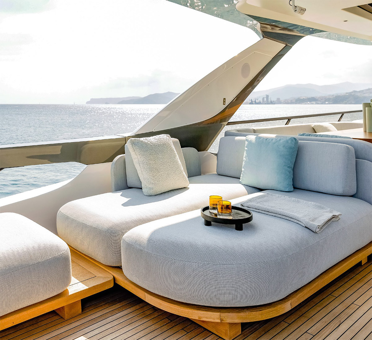 На флайбридже рулевая консоль занимает привычное место на правом борту, напротив дизайнеры поместили С-образную динетту с тиковым столом. На этой открытой палубе также есть зона для загорания, «островной» ветбар с холодильником и ТВ-экраном на подъемнике; помимо лежаков, в корме хватило места для тендера с габаритами 3,3 × 1,7 м. На фордеке обустроена зона отдыха с диваном и еще одним лежаком, большим и трансформируемым.