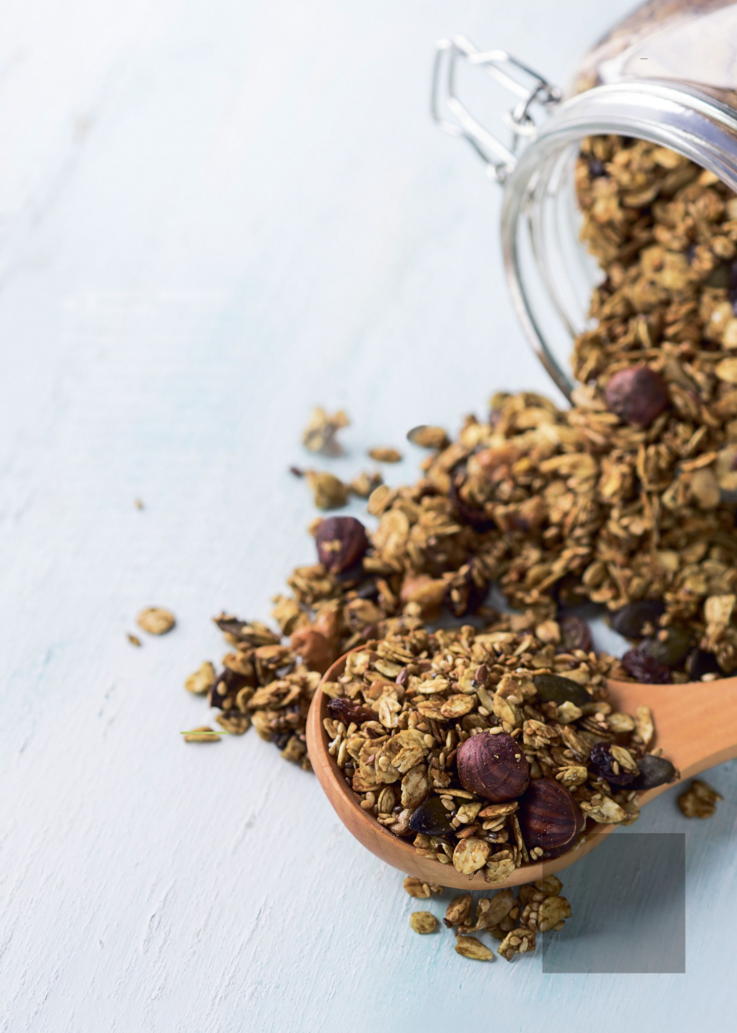 В цельнозерновых блюдах низкое содержание жиров, однако в них есть комплекс углеводов, клетчатка, самые важные витамины и минералы. Они помогают пищеварению и заряжают нас энергией до самого обеда. Рецепты Гордон вкусные и сытные, и в холодные время года на завтрак она предлагает мюсли. «Когда делаешь домашние мюсли, начинаешь экспериментировать, искать интересные варианты — и вскоре — та-дам! — у тебя появляются фирменные