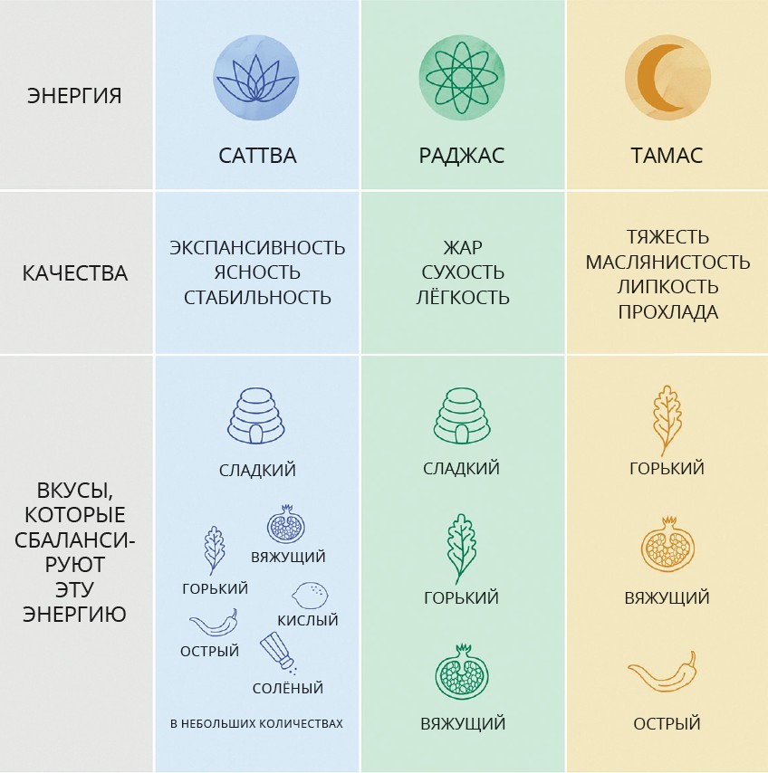 С аттвическая пища легко переваривается, она питательна для тканей, в ней присутствуют все шесть аюрведических вкусов (сладкий, кислый, солёный, острый, горький и вяжущий), которые используются для гармонизации ментальных энергий — саттвы, раджаса и тамаса. С помощью этих шести вкусов можно описать разные типы продуктов и их живительную сущность. Например, сладкий вкус — основа основ саттвической диеты; он отвечает за мягкость и соки, за стихии земли и воды, сила этого вкуса — это сила любви. Кислый и солёный вкусы снабжают нас способностью к регенерации, питают и «заземляют», отвечают за крепкое тело.