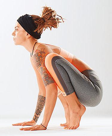 1. Сядьте на корточки, поставьте руки ладонями на пол шире плечевых суставов. Согните руки в локтях так, чтобы предплечья оставались перпендикулярны полу.