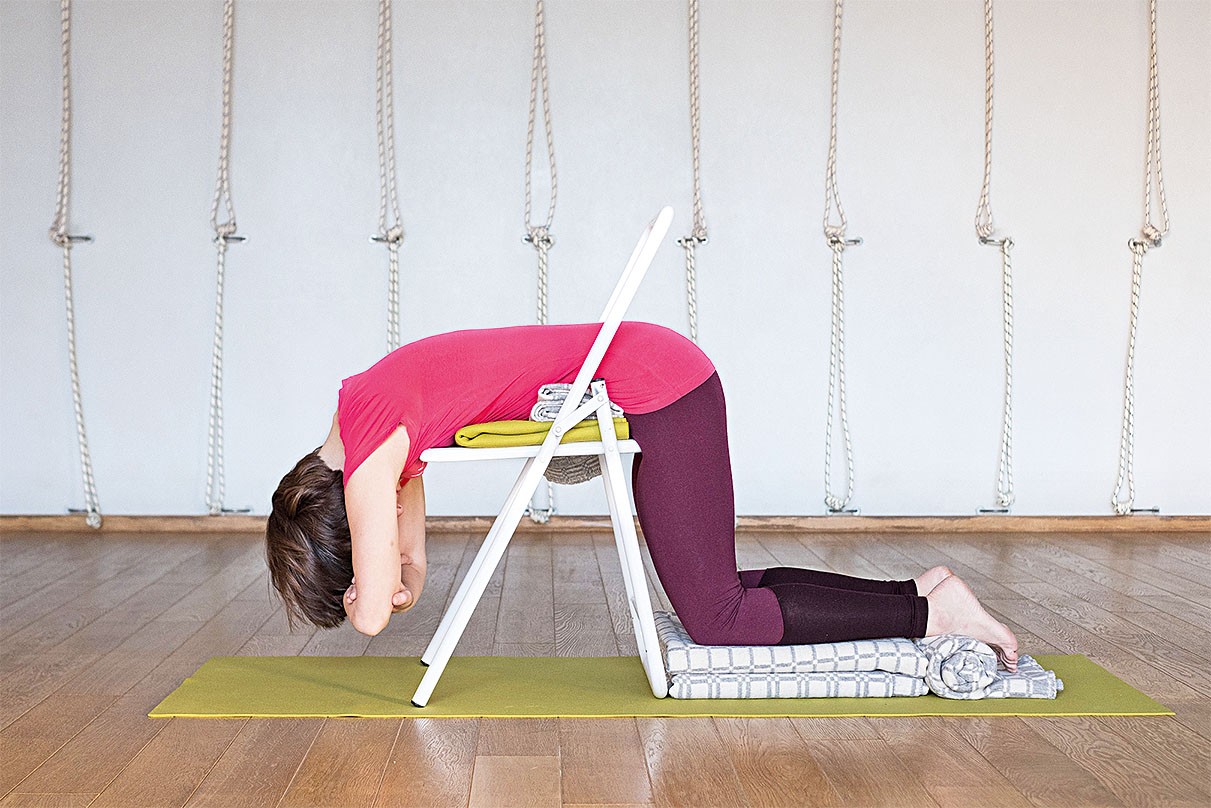 Эту позу называют «Скорой помощью» при острой боли. Её можно выполнять в начале занятия для облегчения боли, а также для расслабления широких пластов внешних мышц вокруг позвоночника. Для выполнения позы вам понадобится стул. Лягте животом на сиденье стула, важно, чтобы колени не касались пола, а свисали вниз, при этом мышцы ягодиц будут двигаться вниз от поясницы, освобождая низ спины. Затем положите под колени опору, чтобы они стояли на ней, но продолжали опускаться вниз. Под лодыжки положите роллы из одеяла. Руки отпустите к полу с другой стороны сиденья, расслабьте голову, шею. Если лёжа на животе, вы чувствуете, что поясница прогибается, положите под живот сложенное одеяло, чтобы поясница вытягивалась и мышцы спины расправлялись в стороны. Находитесь в позе 3-5 минут, чтобы позвоночник смог расслабиться и погрузиться внутрь спины.