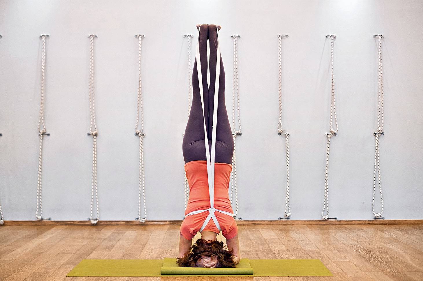 Работу с ремнём полезно использовать и в других позах, например в Супта Тадасане, Уттхита Паршваконасане и даже в Ширшасане. Ширшасану делайте у стены, чтобы не упасть, пока тело не научится держать равновесие в новом положении, так как со шлейкой из ремня полностью меняется работа рук и положение верхней части туловища, и надо учиться держать равновесие заново. В позах стоя плечи и верх спины поднимаются и зажимают шею, поэтому в них надо следить за работой рук.