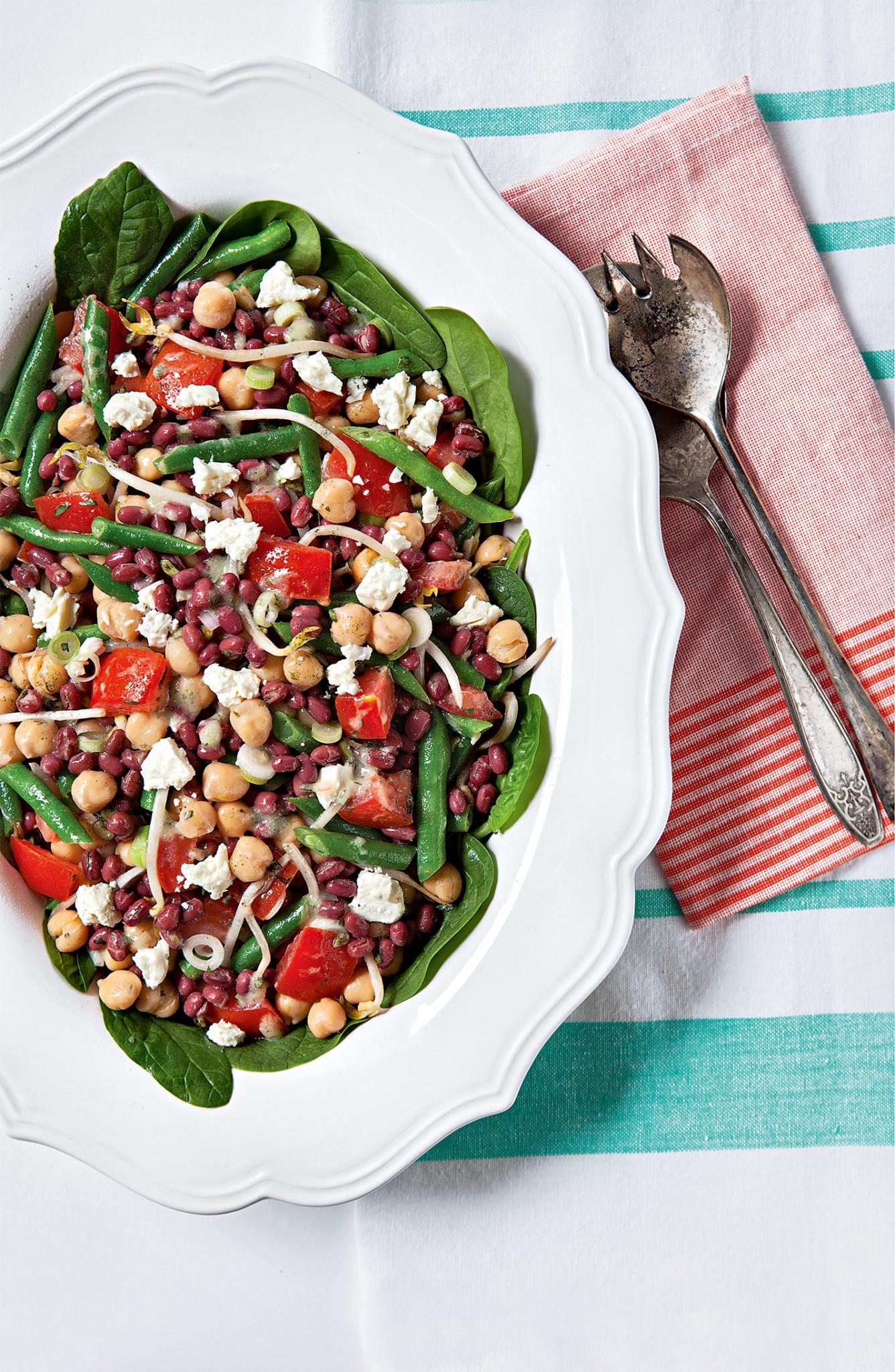 - Салат. Доведите воду до кипения в большой кастрюле и бланшируйте в ней зелёные бобы в течение 1-2 минут. Замочите в миске с ледяной водой, чтобы охладить, слейте воду через дуршлаг и переложите в миску для подачи. Добавьте пророщенные бобы мунг, красную фасоль, нут и лук. Заправьте, посолите, поперчите, перемешайте хорошенько. Охладите в холодильнике. Перед подачей аккуратно вмешайте томаты и фету.