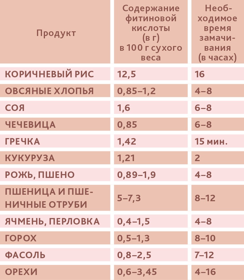 Овёс требует длительного замачивания. Неподверженный тепловой обработке овёс (овёс для проращивания) доступен в отделах здоровой еды в супермаркетах. Его рекомендуют замачивать в кислой среде на 24 часа при температуре 37°С, что устранит часть фитиновой кислоты. Замачивание на ночь овсяных хлопьев с добавлением ржаной муки приводит к небольшому снижению уровня фитиновой кислоты. Полезно ли есть овсянку на регулярной основе – это вопрос.