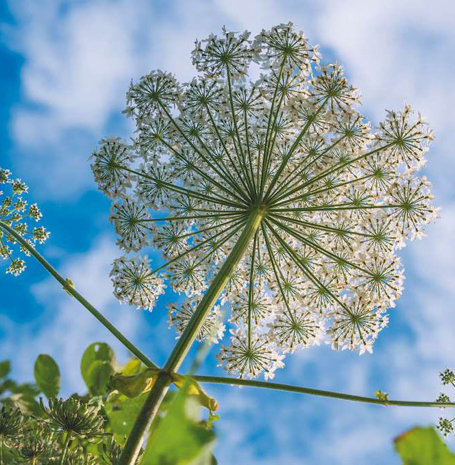 Внешне борщевик напоминает огромный, до 3-4 метров в высоту, укроп с белыми цветками, у него достаточно широкий стебель и соцветия в виде зонтиков. Большинство людей знают, что это растение опасно: сок борщевика вызывает повышенную чувствительность кожи к ультрафиолету. После контакта с ним и воздействия солнечных лучей поражённые участки покрываются сильными ожогами. Иногда они настолько тяжёлые, что люди попадают в реанимацию. Обычно с момента контакта с соком борщевика до
