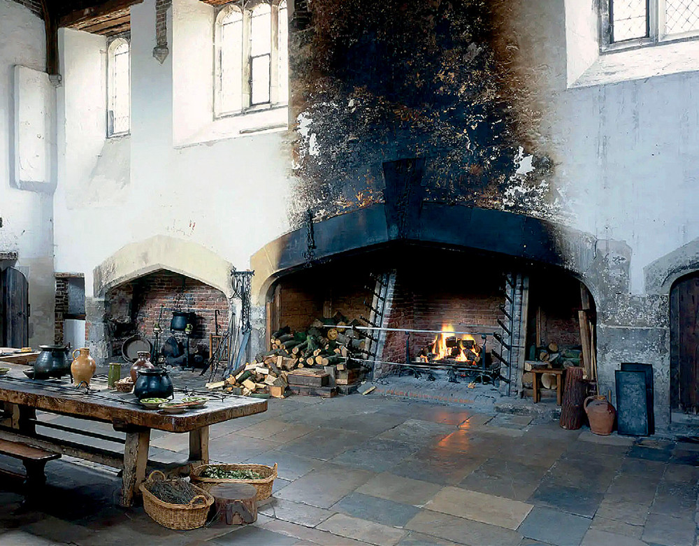В Средние века главным достоинством камина стали его размеры. Он должен был быть настолько большим, чтобы на нем можно было зажарить быка. Внешний вид камина становился более оформленным, строились они прямо в стене, а дымоходная труба в форме перевернутой пирамиды опиралась на консоли или резные столбики.