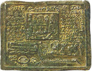 Еще один древний вариант металлической книги – это скрижали из Пирги: три золотые пластины с надписями на этрусском и пуническом языках, датируемые началом V века до н.э., обнаруженные в 1961 году при раскопках этрусского порта Пирги на побережье Тирренского моря в Италии (современный город Санта-Севера). Пластины содержат текст, в котором идет речь о посвящении правителем города Цере, Тефарием Велианой, даров богине Уни, которая в надписи отождествляется с богиней Астартой. Тефарий Велиана подарил их во время обряда Вбивания гвоздя святилищу и храмовой пристройке в третий год своего правления в месяц погребения божества.
