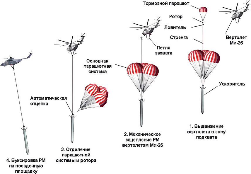 Еще один крупный недостаток парашютов – скорость ввода, которая обычно меньше или равна (для сложной многоступенчатой системы спасения) местной скорости звука. Несколько лет назад инновационная компания «Атмосфера», которую тогда возглавлял ветеран ракетно-космической отрасли В.Н. Чижухин, предложила оригинальный метод спасения ступеней на основе воздушно-космических парашютных систем (ВКПС). Суть сводится к использованию гиперзвуковых парашютов из термостойкой композитной ткани, которые вводятся еще на участке подъема ступени в крайне разреженной атмосфере.