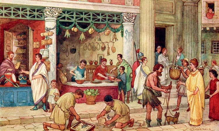 Но вскоре в городских стенах стало тесно. За рвом начали появляться усадьбы, новый район быстро разрастался. Возникла густая сеть улиц. Самая широкая пересекала город с севера на юг. От нее расходились кривые проулки, ведущие к усадьбам. Иногда они превращались в настоящие лабиринты и были такие узкие, что порой два человека с трудом могли разойтись в них. Усадьбы немного напоминали наши современные таунхаузы: небольшой дворик и примыкающий к нему дом. Но это, конечно, шутка. «Таунхаузы» были приземистые, сложенные из камня, не имели ни окон, ни дверей. Полы и стены домов были глинобитными, крыши покрывали тростником, иногда привозной черепицей. Печей в хижинах не было, но в крыше была дыра. Через нее наружу выходил дым от очага. Называлось это «топить по-черному». Кроме очага помещения отапливались переносными жаровнями. Когда опускалась ночь, в доме зажигали светильники. Их заполняли рыбьим жиром или оливковым маслом, а в рожок вставляли фитиль.