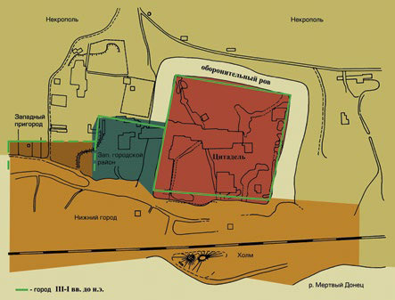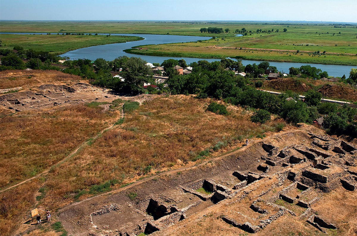 Он вырос на краю обрывистого берега, в устье реки Танаис (Северный Донец), недалеко от того места, где она впадает в Азовское море. Центральная часть его представляла собой прямоугольник, укрепленный мощными каменными стенами до четырех метров толщиной, с башнями и рвом, глубина которого достигала семи-восьми метров. В одной из башен археологи нашли осколки амфоры. На ней охрой (красной краской) было написано «Nafa», а на внутренней поверхности сохранились остатки нефти. Возможно, ее использовали для освещения – башня могла служить маяком, который указывал путь кораблям к городу.