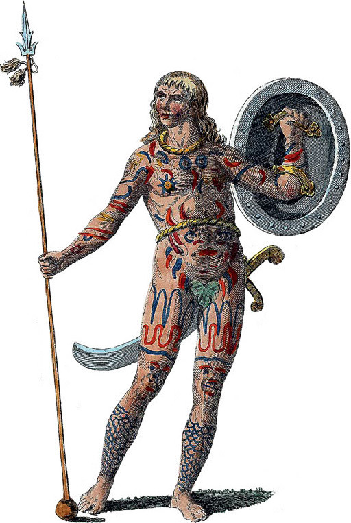 Как мы уже знаем, пикты сражались обнаженными. Не все исследователи рассматривают всерьез такую возможность, однако это не исключено, поскольку на некоторых сохранившихся изображениях пикты предстают без одежды. Возможно, они раздевались лишь перед боем, взывая к божественной защите, что могло быть связано с магическими символами на их телах. К тому же обнаженного соперника сложнее схватить в ближнем бою. Не стоит исключать и психологический момент: целая армия обнаженных татуированных варваров должна была внушать противникам ужас одним своим видом.