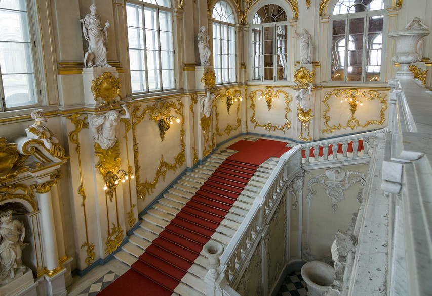 Знакомство с дворцовыми интерьерами начинается с Иорданской лестницы. В XVIII веке она называлась Посольской, поскольку по ней поднимались послы, а нынешнее название произошло от слова «иордань» — прорубь крестообразной формы. На православный праздник Крещения Господня по этой лестнице спускались к Неве, чтобы окунуться в ее воды.